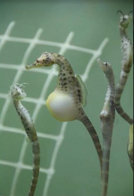 Farasi wa baharini dume ndiye anayebeba mimba na kujifungua Watoto. Farasi wa baharini dume hana mayai au mji wa mimba lakini ana kifuko cha kizazi kama sehemu ya mwili wao ambacho kinapokea mayai ambayo hayajarutubishwa kutoka kwa jike. Kifuko hiki kinapatikana mbele ya tumbo lao.