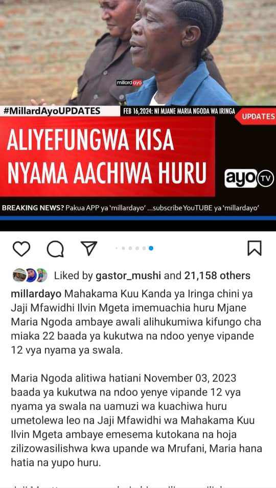 Moja ya kesi iliyotikisa mkoa wa Iringa na Tanzania kwa ujumla ni kesi ya mama Maria Ngoda, aliyehukumiwa kifungo cha miaka 22 baada ya kukutwa na vipande 12 vya nyama ya swala kinyme na sheria.