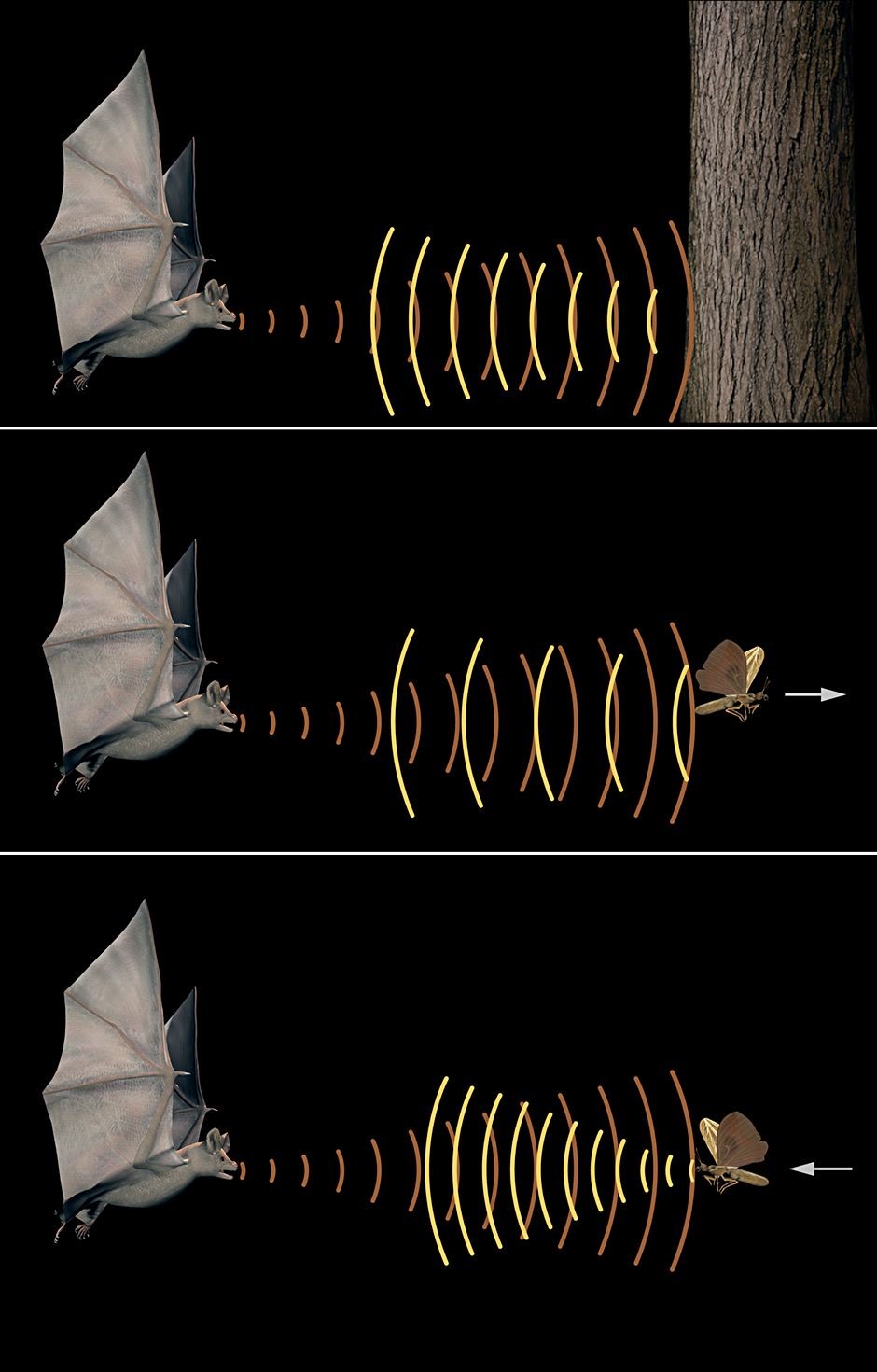 Popo wala wadudu ndio jamii ya popo inayotumia zaidi mwangwi kwa ajili ya kubaini na kunasa wadudu warukao na kuwafanya chakula chao. Popo hawa hutoa mawimbi makali ya sauti (high frequency) ambapo yakikutana na kizuizi humrudia kama mwangwi, na kumsaidia kutambua ukubwa na umbali wa kitu kilichorudisha mwangwi. Hii humsaidia kutambua wadudu kwa urahisi kwani bila hata kutumia macho huweza kunasa wadudu warukao pale mwangwi unapomrudia ukiwa na mawimbi madogo.