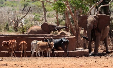 Picha na Thomas Mukoya; Tembo na ng’ombe katika chanzo kimoja cha maji,